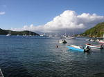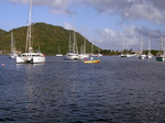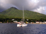 Norden der Insel Dominica, näher. Auf der Reede von Portsmouth werden wir auf karibisch empfangen. Unsere Leine wird an einer Boje festgemacht, der Müll wird entsorgt und Bananen, frisches Brot und