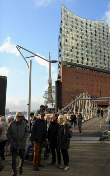 In der angegliederten Cafeteria nehmen wir einen Imbiss zu uns, bevor uns der Bus zum neuen Wahrzeichen Hamburgs bringt, der von den Hamburgern liebevoll „Elphi“ genannten Elbphilharmonie. Hier besuchen wir die Plaza für jedermann, von der man einen phantastischen Aus- und Überblick auf den Hamburger Hafen sowie Teile der Stadt hat. Wir sind überwältigt. Das ist ein gelungenes Bauwerk, auch wenn es bis zur Fertigstellung lange gedauert hat und viel teurer geworden ist als ursprünglich mal geplant .