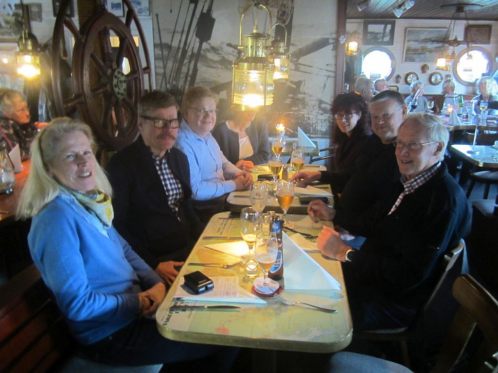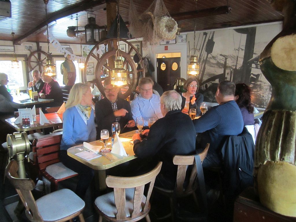 Die Rückfahrt von der früheren Elbinsel Finkenwerder mit Bus und Fähre verzögert sich, so daß wir mit erheblicher Verspätung in der „Dübelsbrücker Kajüt“ auf der anderen Elbseite ankommen. In diesem gemütlichen Kultlokal nehmen wir unter lebhaftem Geplauder einen Imbiß zu uns. Viel Zeit zum relaxen bis zum Abendessen bleibt nicht mehr. Am Abend gehen wir gemeinsam ins „Witthüs“. Dieses hübsche Haus ist weit über die Grenzen Hamburgs bekannt und eine Institution in der Stadt. Es liegt zauberhaft in einem der größten Englischen Gärten der Elbvororte, dem Hirschpark in Blankenese, nur wenige Schritte von der Elbe entfernt.