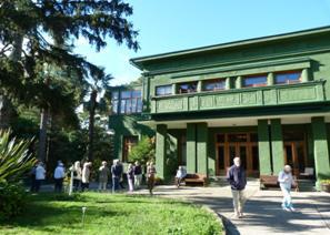 Am nächsten Morgen ging es hoch hinaus ins Skigebiet der Olympischen Spiele nach "Krasnaja Poljana", noch ohne Schnee. Mit einer Gondel fuhren wir auf 1660m bei 9 °C. Leider verbarg sich der Hohe Kaukasus hinter Wolken. Wir konnten aber einen guten Überblick der olympischen Stätten gewinnen. In der Bergstation gab es leckeren Borschtsch und geräucherten Wildbirnensaft. Nach einem kleinen Rundgang gondelten wir zurück ins etwas wärmere Tal und besuchten den Park der russischen Ethnien: verschiedene Architekturen des Riesenreiches. Unser Reiseführer Aleksandre aus Sotschi hat uns allzeit souverän in drei Sprachen als liebenswerter Betreuer und unerschöpliches Lexikon zur Verfügung gestanden.