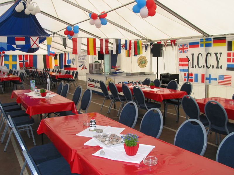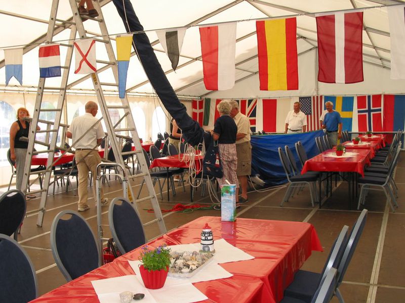 Am 10. Juli trafen sich die ersten TYvD Mitglieder, um Hand anzulegen und alles in die richtigen Bahnen zu bringen. Am Montagmorgen um 8.00 Uhr ging der Aufbau des großen Zeltes los, dann trafen immer mehr Freunde ein und das Zelt wurde dekoriert, die Tische und Stühle hin und her geschoben, Spinnaker unter die Zeltwand gezurrt, die Theke wurde aufgestellt und angeschlossen. Das erste kalte Bier schmeckte gut. Dithmarscher Hell und Dunkel - große Klasse.