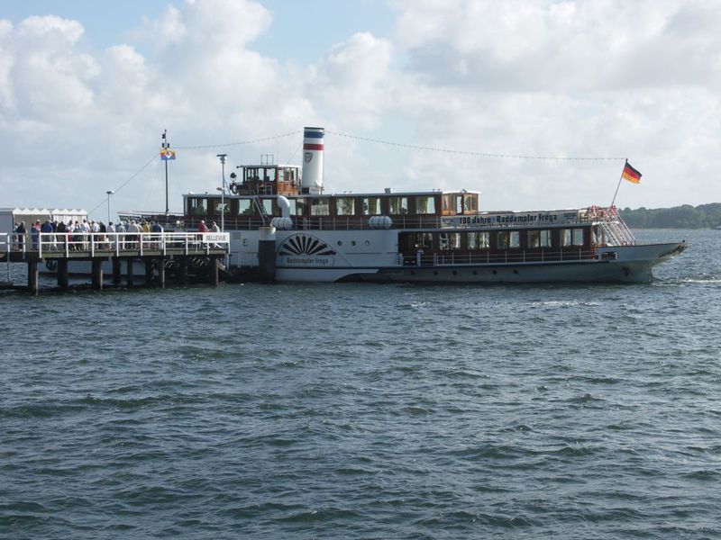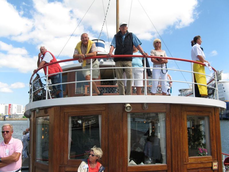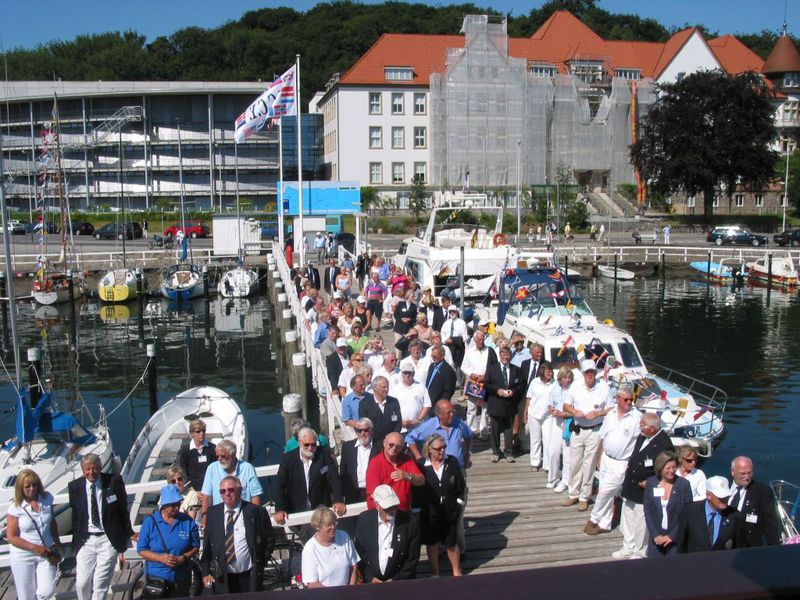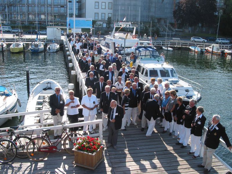 An der Seebäderbrücke „Bellevue“ lag der Raddampfer „FREYA“ - er wartete auf 150 gut gelaunte ICCY Teilnehmer. An Bord gab es Erbsensuppe mit Wurst und eine unglaublich gute Jazzkapelle. Die Rundfahrt durch die Kieler Förde bis zum Marinedenkmal Laboe und zurück verlief wie im Fluge. Die Dixieland und New Orleans Musiker wurden von unserem englischen Seglerkameraden Dick Smith verstärkt, der im kommenden Jahr beim Treffen in Ramsgate seine eigene Band auf die Bühne bringen wird.