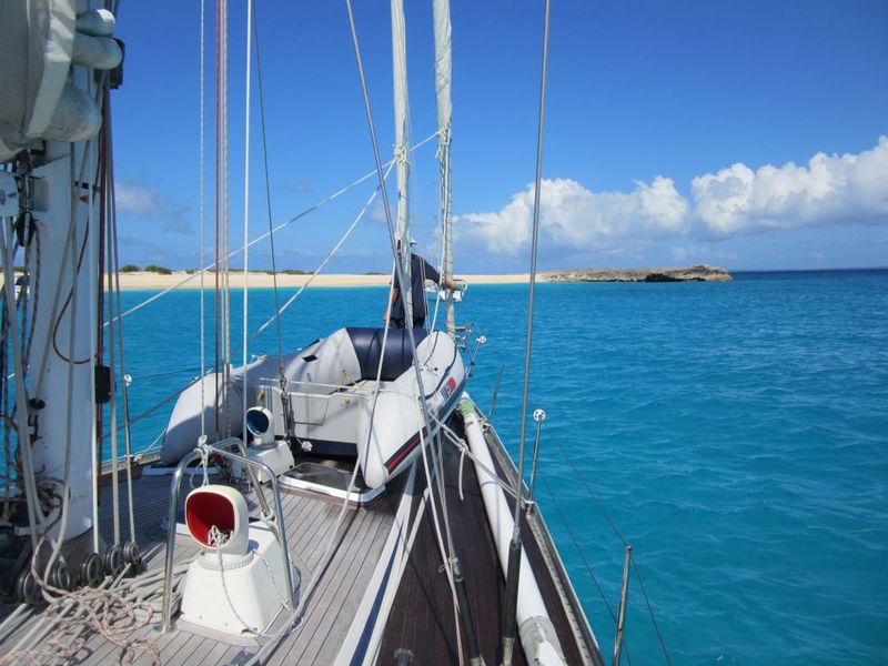 Mittwoch, 29.10.2017 (Tag 11) Sonne, Sonne, Sonne und Wärme. Zunächst wird die Reparatur vorgenommen. Wir nehmen das Vorsegel weg und holen den Großbaum dicht. Nach kurzer Beratung basteln wir an der Baumnock mit einem Ende reckfreier Leine einen neuen Holepunkt für die Großschot und eine Öse für den „Bullen“. Nicht schön, aber selten. Nach der Reparatur, die sich als brauchbar, aber noch verbesserungsbedürftig und -fähig erweist, setzen wir dann den Spi bei 16 Kn Wind, der uns den ganzen Tag mit 6-7 Kn in Richtung St. Lucia zieht, allerdings immer noch mit südlichem Einschlag. Mittag: 140 Sm. Der Spi hat 36 Stunden gestanden , laut Ronny , so lange hat er ihn noch nie oben gehabt.