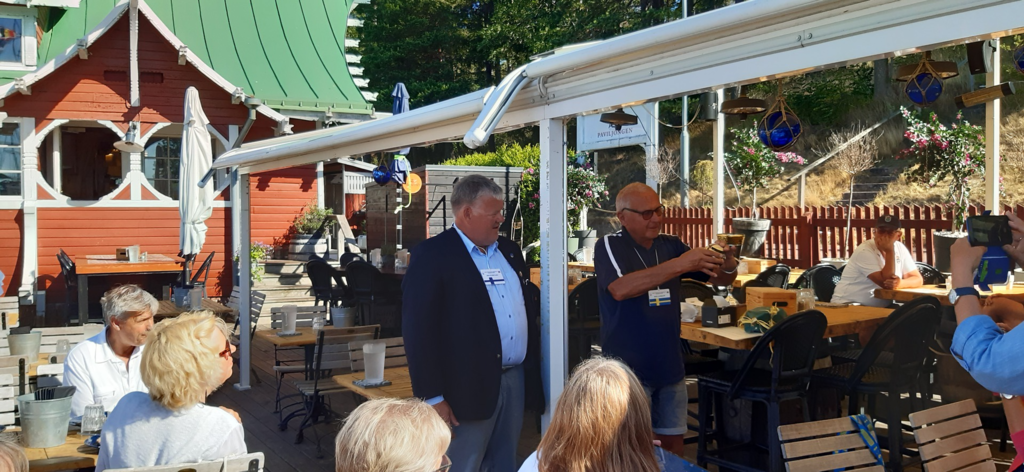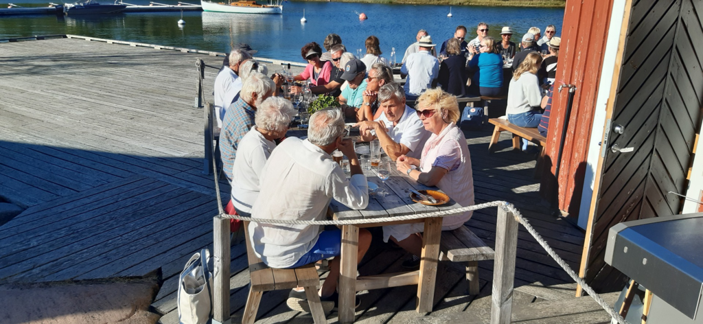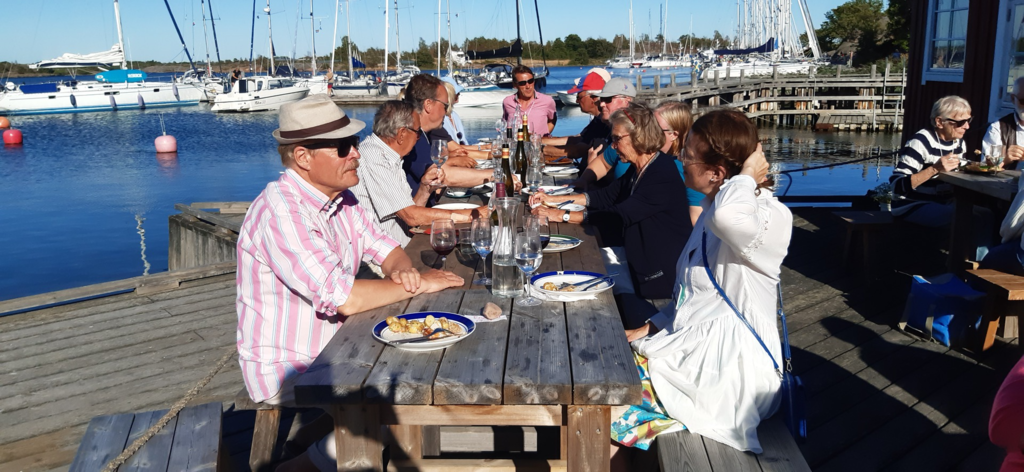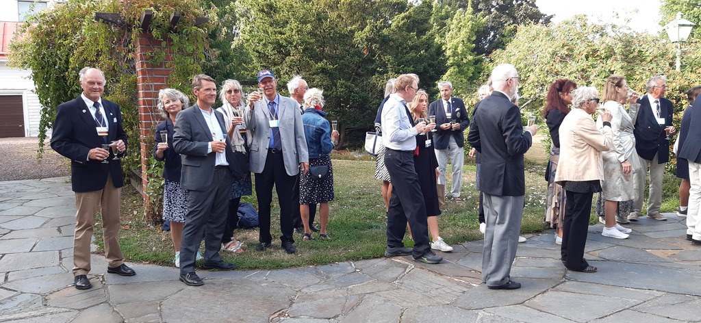 Herr Wiklöf weiß so vieles zu erzählen, dass nach unserer Rückkehr zum Hafen nur wenig Zeit zum Umziehen bleibt. Auf dem Weg zum Hotel Arkipelag, wo uns das Galaessen serviert wird, werden wir im Garten des Rathauses auf einen Umtrunk eingeladen. Nach dem Galaessen geht ein abwechslungsreicher Tag zu Ende.