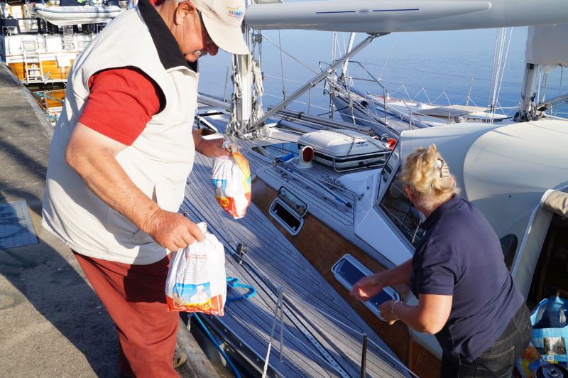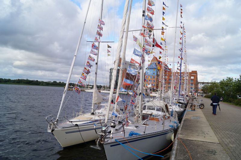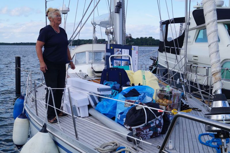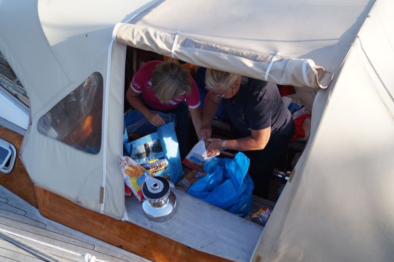 Da werden schon die Kisten mit den „Welcome Tüten“ geliefert. Alles wieder an Bord. Die Sonneneinstrahlung ist für die Wurst nicht gut, alles wieder runter unter Deck, aber wohin? Wir müssen noch Sekt besorgen, kurze Hochrechnung, 30 Flaschen, das wird der Einkaufswagen schon schaffen!  Das wäre das kleinste Problem gewesen…30 Flaschen ohne Vorbestellung… bis morgen, unmöglich. Nur die Hausmarke…das können wir Klaus nicht antun, er hat eine Rotkäppchen Phobie! (Wird doch nicht ein traumatisches Erlebnis aus Kindertagen dahinter verborgen sein?) Recherche im Netz, Getränkemarkt in 8 km Entfernung. Hinsegeln? Zum Glück haben wir ein Auto. Zeitaufwand im Rostocker Feierabendverkehr 1 ½ Stunden. Und wo verstauen wir die Kisten nun wieder? Unterm Tisch. Wir können ja abends essen gehen und zum Frühstücken die Beine anziehen.