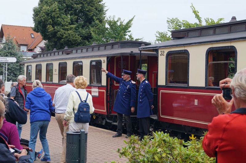 Im Doberaner Münster war ich schon erstaunt, sind wir doch fast alle schon im „Knackalter“, wie eisern die 122 Stufen ins Gewölbe erklommen wurden. Auf dem Weg zum Bahnhof kamen wir dann, glücklicherweise, an der Klosterbrauerei NICHT vorbei. Das beste Bier ist aber immer noch das Freibier, diesmal von der Mollybahngesellschaft, trotz dass  es beim „Essen fassen“ Ungereimtheiten gab. „Rien ne va plus“, hieß es dann im Seebad Kühlungsborn, nachdem ein Scherzkeks mittels eines Knopfdrucks, die Busse lahm gelegt hat. Das Funknetz glühte, neue Busse(?), der Zeitplan(!), wo bekommen wir noch eine Pute her (Unverträglichkeit von Schwein eines Teilnehmers), im Rostocker Yachtclub ist der Grill schon auf Temperatur… Aufatmen, die Hotline verweist auf ein Reset…der blockierende Bus lässt sich wieder starten! Doch noch pünktlich, konnten wir bei den Freunden auf der anderen Seite der Warnow, einlaufen. Wieso haben 2 nur den Start verpasst? Die Steaks und Würste waren lecker, die Butterbrote eine Delikatesse, das Bier gut gekühlt und zu fortgeschrittener Stunde wärmte der Jägermeister ausgiebig.