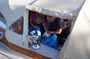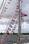 Aus allen nur möglichen Ecken musste die gesamte, „mitgesegelte“ Ausrüstung, in gebückter Demutshaltung, von Bord gezerrt werden. Freiwillige vor, die Fahnenmasten zusammen bauen und aufstellen. Wohin mit den Zeltstangen, den Säcken mit dem Zelt… und da müssen noch die 3 Tische raus…endlich Platz!