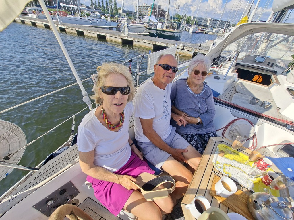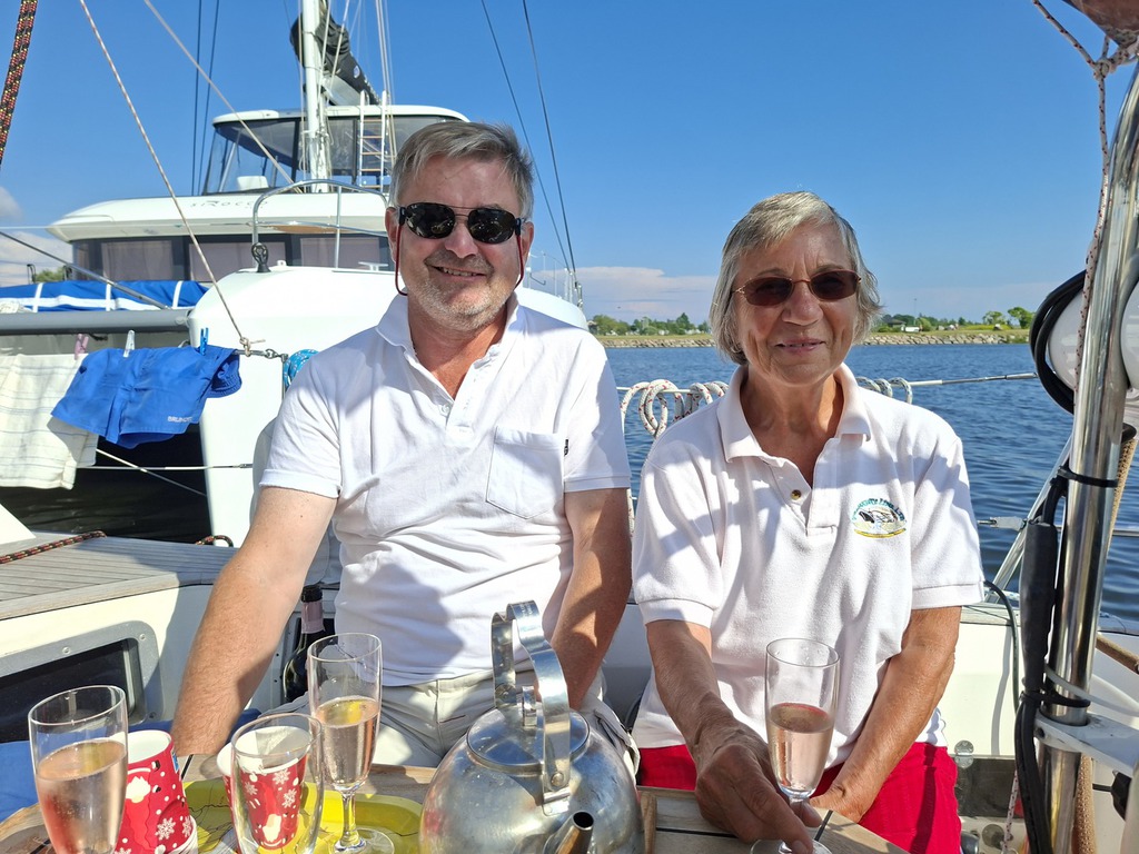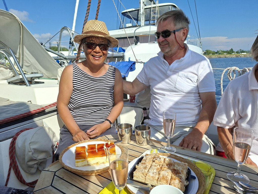 Bereits am Sonntag fanden sich alle Boote im Yachthafen von Kuresaarre ein. Die Aino III lud nachmittags zum Kaffee ein, wobei Kaffee eigentlich nur Nebensache war. Es wurde mit Procecco und viel Kuchen auf das Treffen bei strahlendem Sonnenschein angestoßen.